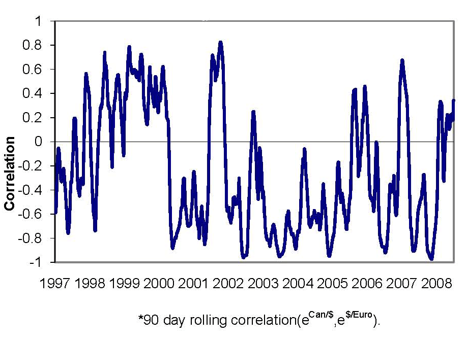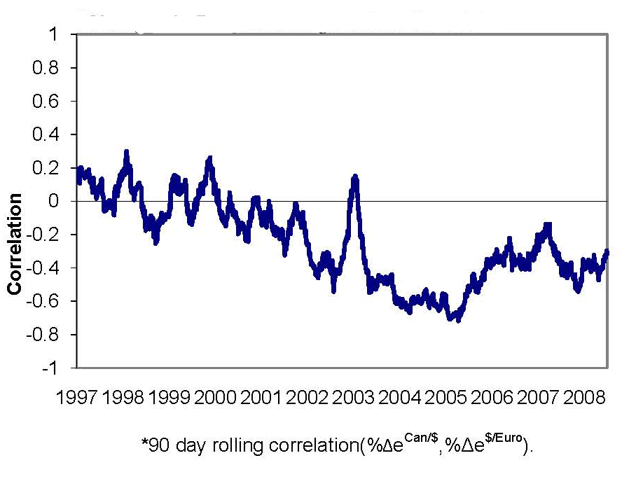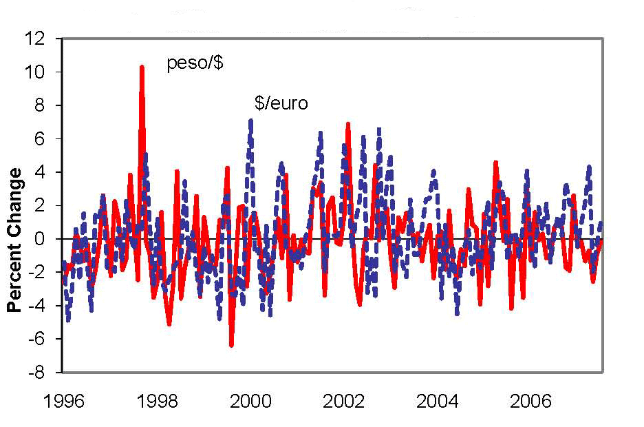 What accounts for the unusual positive correlation of the Mexican peso with the dollar's value against other major currencies such as the euro? The factor that comes most readily to mind is Mexico's proximity to, and thus close integration with, the United States. The United States is the major market for Mexican manufactures, and the manufacturing sector is playing an increasingly important role in overall Mexican economic activity. Possibly, the types of shocks that boost U.S. output, interest rates, and exchange rates relative to the euro area--for example, a shock to U.S. investment spending--might boost Mexican output, interest rates, and exchange rates to an even greater extent. Even so, this cannot be the whole story. Canada is also next door to and highly integrated with the United States, and yet the exchange rate of the Canadian dollar against the U.S. dollar exhibits the more normal negative correlation with the dollar/euro rate.