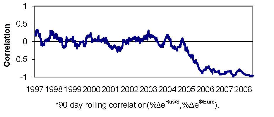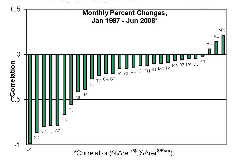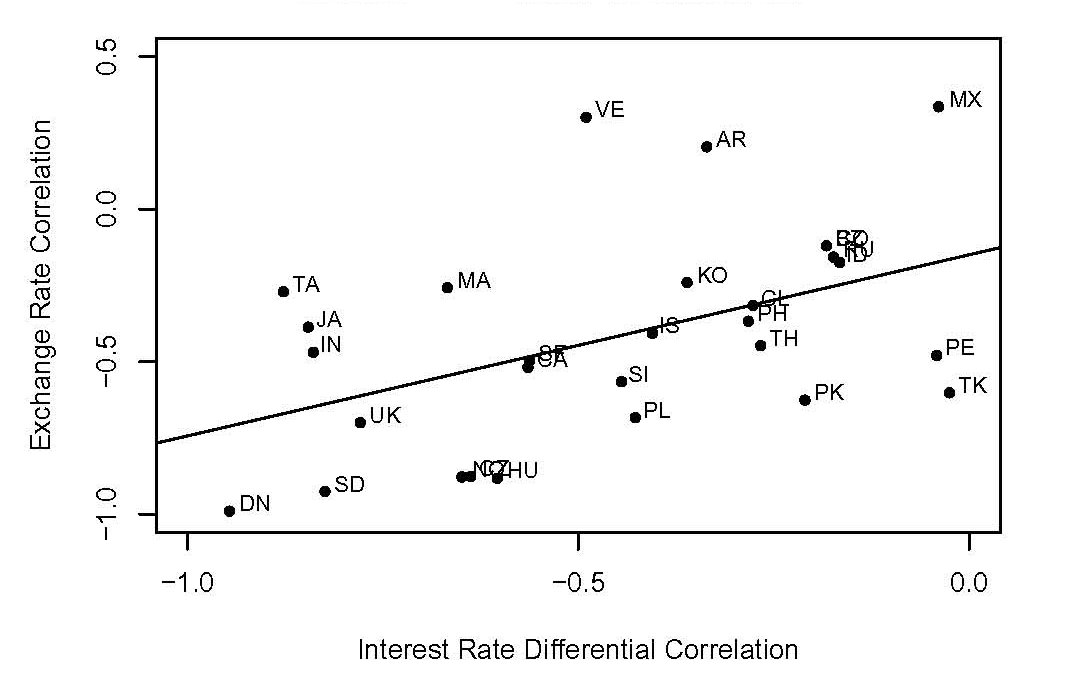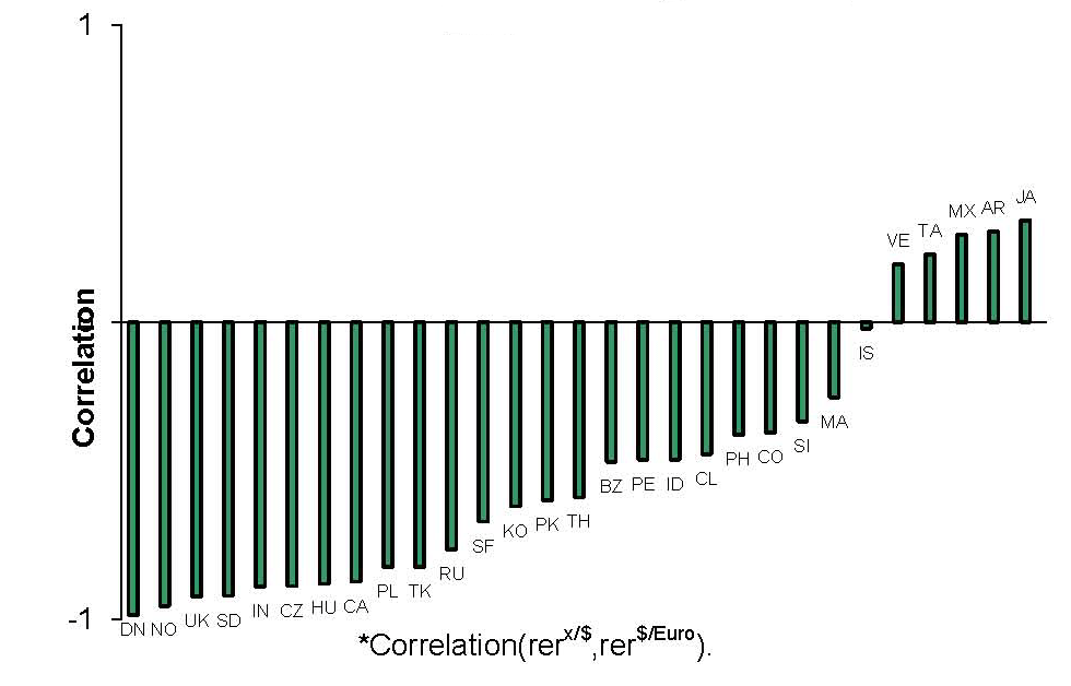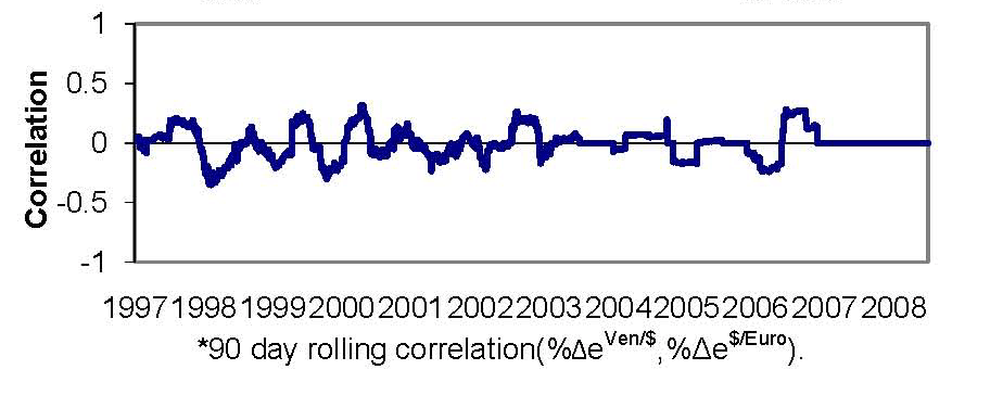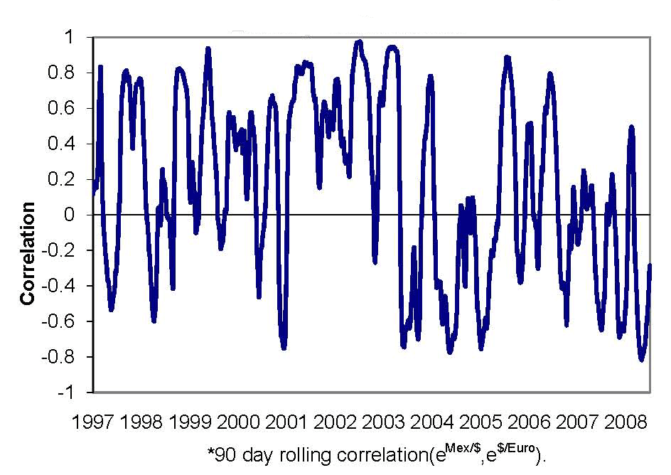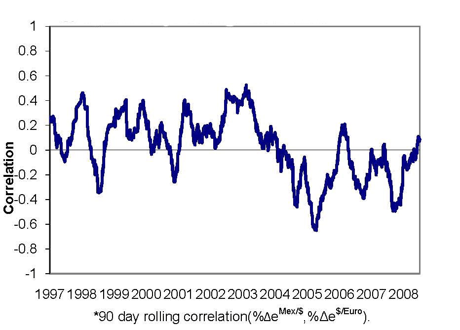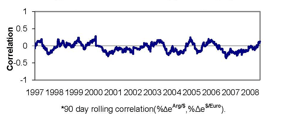 It then follows that the correlation of the peso/dollar exchange rate with the dollar/euro exchange rate will reflect the correlation of the peso/dollar interest rate differential with the dollar/euro interest rate differential:3