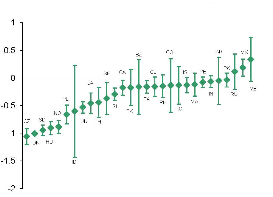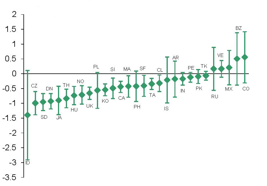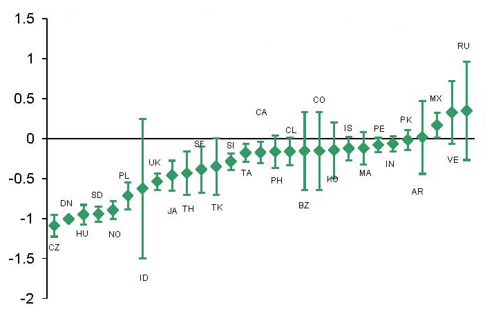 Evidence of the unusual behavior of the peso is reinforced by Chart 6, which presents correlations of monthly percent changes in nominal exchange rates against the dollar with changes in dollar/euro exchange rates. Of the 29 currencies shown, only four exhibit a positive correlation in percent changes, and the Mexican peso's is the highest. Chart 7 presents the analogous regression coefficients based on monthly percent changes in exchange rates. Mexico has the only coefficient that is significantly above zero. Chart 8 again confirms that regression coefficients and ordinary correlations provide similar information.