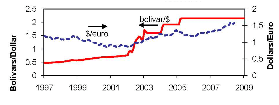 Chart 1 illustrates this behavior, plotting the level of the nominal peso/dollar exchange rate against the level of the dollar/euro rate during the period 1997 through mid-2008; the correlation between the two series is 0.56.2 (The dollar/euro exchange rate is represented by the ECU, or European Currency Unit, for dates prior to the euro's inception in 1999; see Appendix for additional detail.) The relationship between the two exchange rates is also apparent in Chart 2, which plots monthly percentage changes; the correlation is 0.18.