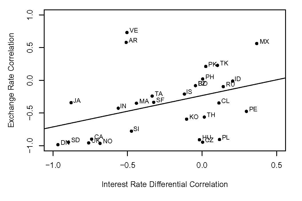 The scatter plot reveals the expected positive relationship between the two sets of correlations: the correlation of the interest rate differential between a given country and the United States with the interest rate differential between the U.S. and the euro area is positively associated with the correlation between that country's exchange rate against the dollar with the dollar/euro exchange rate. The slope of the regression line is 0.48, and it is significant at the 5 percent level. Note that Mexico is the only country whose correlations of interest rate differentials and exchange rates both exceed zero by a substantial margin. It appears that when U.S. interest rates rise relative to euro rates, Mexican interest rates rise relative to dollar rates--this may explain at least part of the positive response of peso/dollar exchange rates to dollar/euro exchange rates.