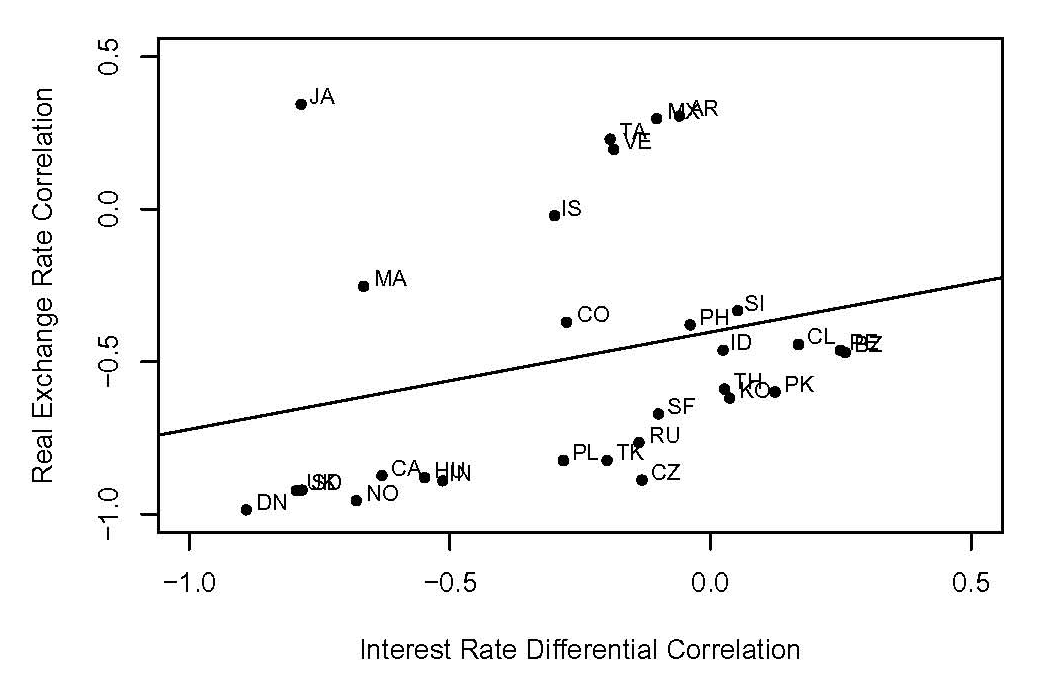 So far, we have referred to nominal variables in our summary of UIP and in our correlation analysis. However, the assumption that the future expected exchange rate is constant makes more sense if the analysis is re-cast in terms of real exchange rates rather than nominal rates. Starting with the nominal UIP equation (1), above, it is straightforward to derive a version of equation (3) that expresses the current real exchange rate as a function of the real interest rate differential and a constant equilibrium real exchange rate: