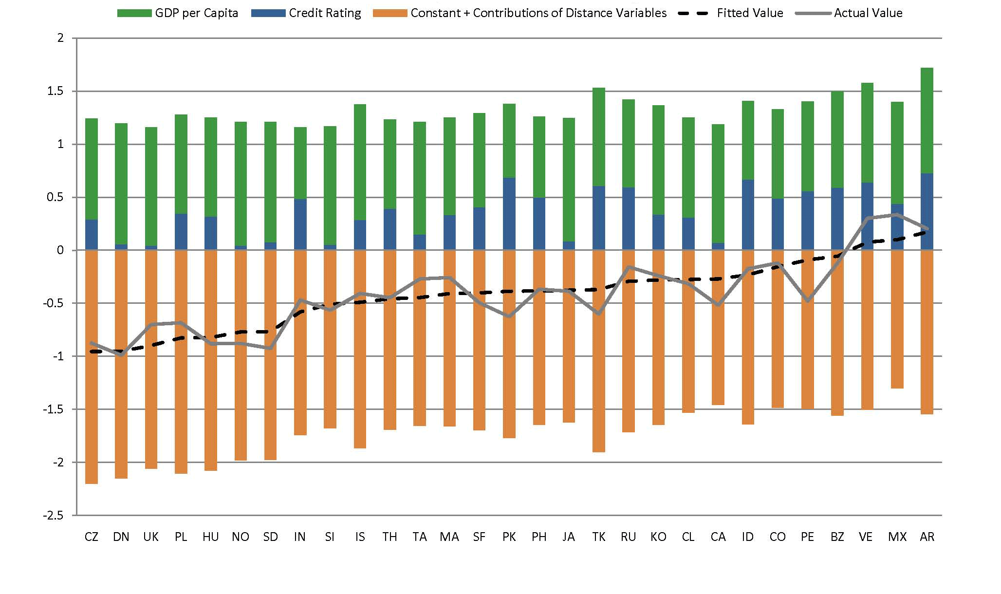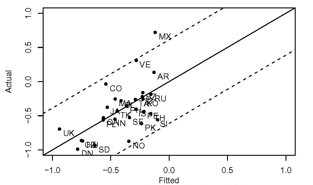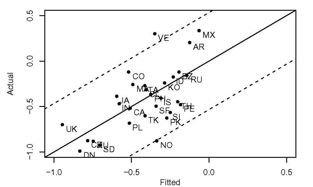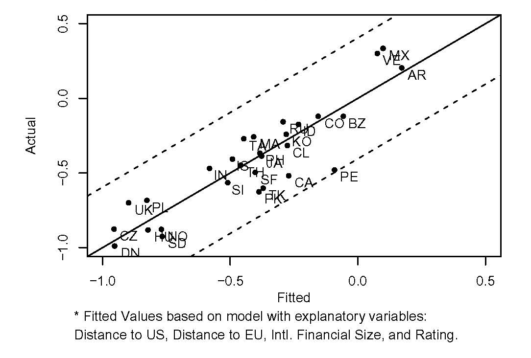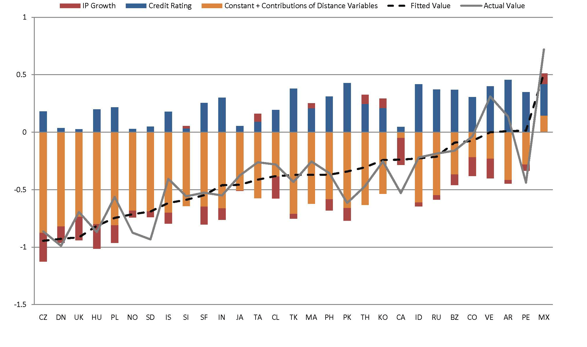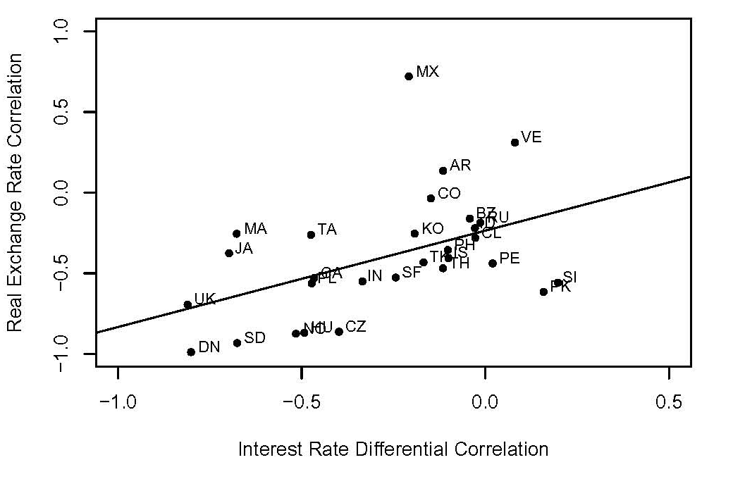 Even so, Mexico is a substantial outlier: Whereas the correlation of its real exchange rate movements against the dollar with dollar movements against the euro (the y-axis) is the highest in the sample, the correlation of Mexico-U.S. real interest rate differentials with U.S.-euro differentials (the x-axis) is negative and unremarkable. This may reflect that our calculations of ex post real interest rates are poor proxies for the ex ante real interest rates that influence exchange rate movements. Alternatively, other factors besides interest rate differentials may be influencing exchange rates.