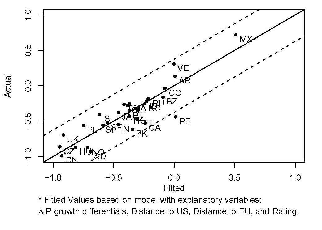 8. To provide an example, consider the 2002.07 observation for Mexico. To compute the first argument in the correlation, Mexican IP growth between 2001.07 and 2002.07 is subtracted from U.S. IP growth over the same period. From this calculation is then subtracted the difference between U.S. and Mexico IP growth during the preceding year, of 2000.07 to 2001.07. The analogous computations are then made for the second argument of the correlation, the change in IP growth differential between U.S. and euro area. Return to text