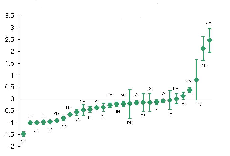 Chart 3 puts the correlation between the levels of the peso/dollar and dollar/euro exchange rates in perspective, comparing it with correlations of other nominal exchange rates against the dollar with the dollar/euro rate. Chart 3 makes clear that the peso/dollar exchange rate's response to movements in dollar/euro is unusual. Of the 29 currencies shown, only 6 exhibit a positive correlation in levels; only the Argentine peso and the Venezuelan bolivar - which have not been market-determined in most of the sample period - have exhibited a higher correlation. Chart 4 presents similar information. It plots the response of different countries' exchange rates against the dollar to the dollar/euro exchange rate, estimated using OLS regressions; the diamond for each country is the coefficient on the dollar/euro exchange rate, while the vertical lines represent two-standard-error bands. The Mexican coefficient is clearly positive, significantly different from zero, and very precisely estimated, albeit lower than that of Turkey, Argentina and Venezuela. Chart 5 compares estimates of correlations with estimates of regression coefficients; it suggests that, for the most part, the regression coefficients and the ordinary correlations are providing similar information.