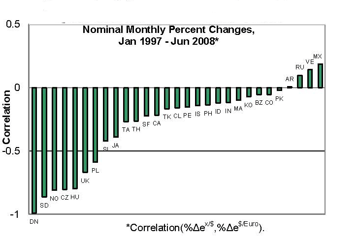 The research that comes closest to bearing on the unusual behavior of the Mexican peso is Fratzscher (2008). This paper evaluates the impact of shocks to placecountry-regionU.S. monetary policy and economic performances on the values of different currencies. It finds that shocks tending to lower the value of the dollar (for example, a higher-than-expected employment report) tend to lower the dollar most against the euro and Swiss franc and least against emerging market countries. But most interesting for our purposes is that such shocks would actually boost the value of the dollar against a few currencies: in ascending order, Hong Kong, Argentina, Venezuela, Chile, and most of all, Mexico! Thus, the pattern of correlations we have documented corresponds closely to the pattern of response to shocks documented in Fratzscher (2008).