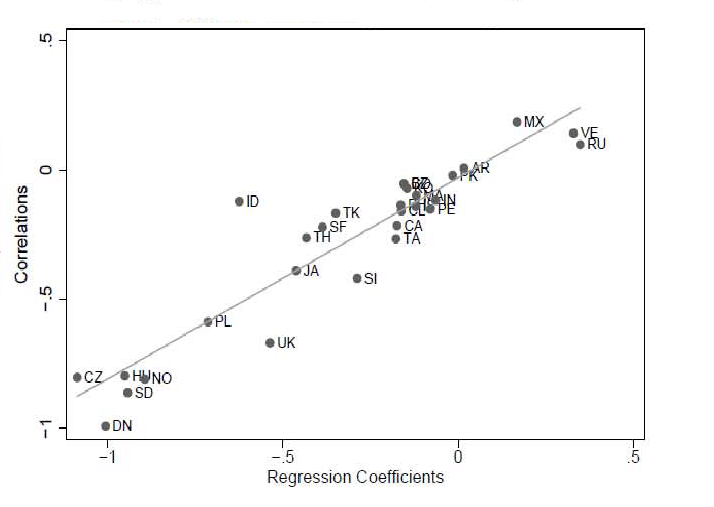 Table 4. Cross-Country Regressions for Correlations of Real Exchange Rates with Additional Regressors � Dependent Variable: Correlation (12-month change in nominal exchange rate of country x against dollar, 12-month change in real exchange rate of dollar against euro)