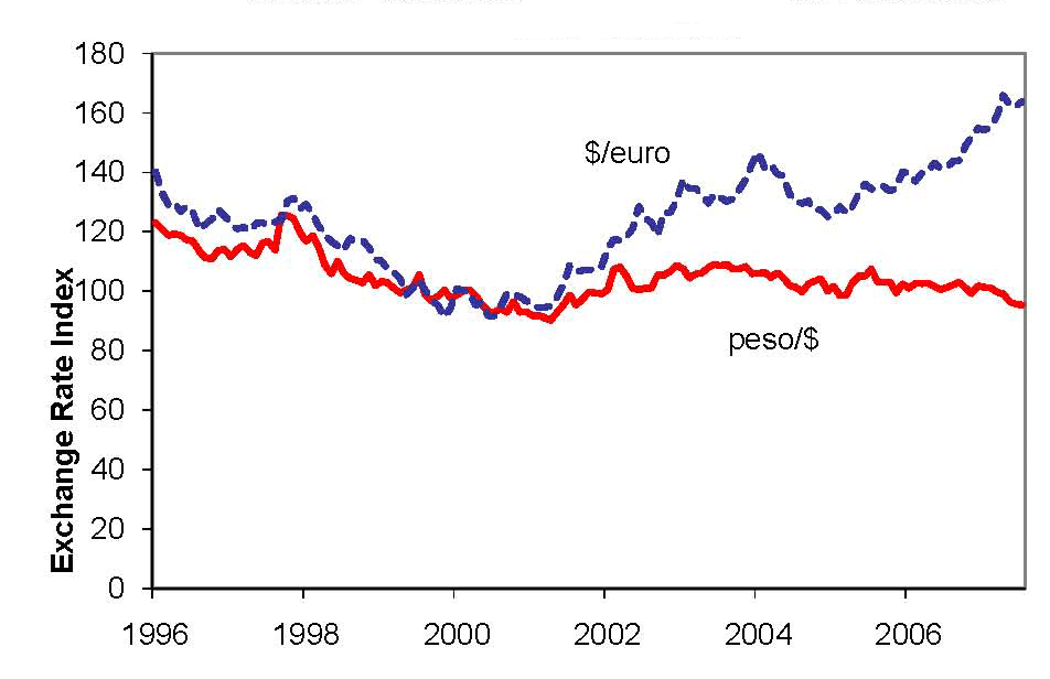 The Mexican peso has been floating since shortly after the country's financial crisis at the end of 1994. Since then, some observers have noted an unusual aspect of the peso's behavior: During periods when the U.S. dollar has risen (fallen) against other major currencies such as the euro, the peso has risen (fallen) against the dollar.1 This pattern implies that when the dollar rises (falls) against other major currencies, the peso rises (falls) against those other currencies by an even greater extent.