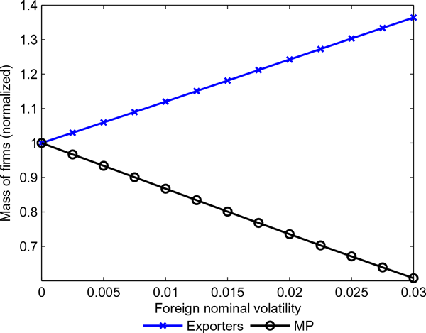 13. This is also the basic result from Russ (2007), showing that higher foreign volatility is relatively better for home firms over foreign firms in the foreign market. Return to text