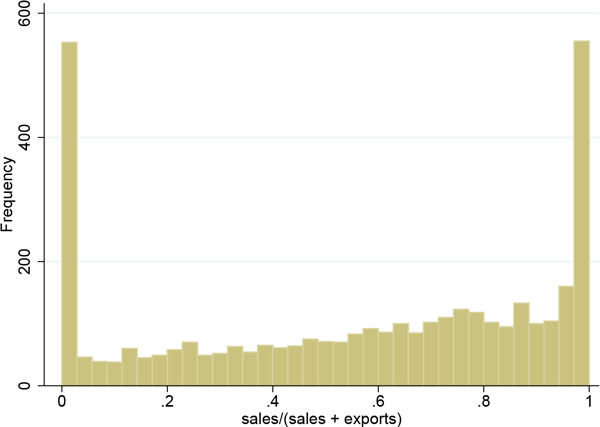| sales/(sales + exports) | 3730 | 0.563 | 0.3514721 | 0 | 1 |