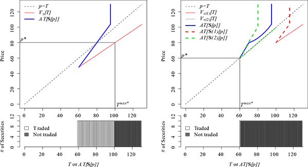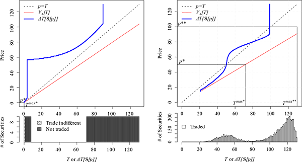 Figure 3: Left panel: A significant mass of payoffs close to zero can preclude all trade. Right panel: Multiple equilibria.