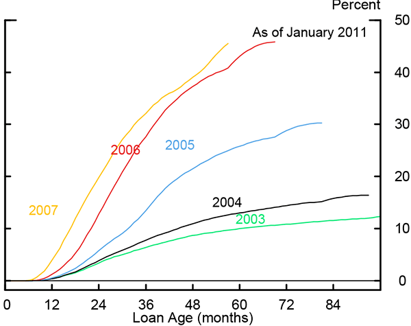 Figure 4: Cumulative defaults on subprime loans. Source: Federal Reserve Board calculations using CoreLogic data.