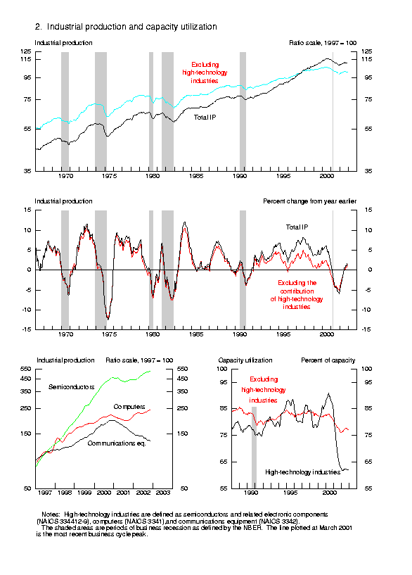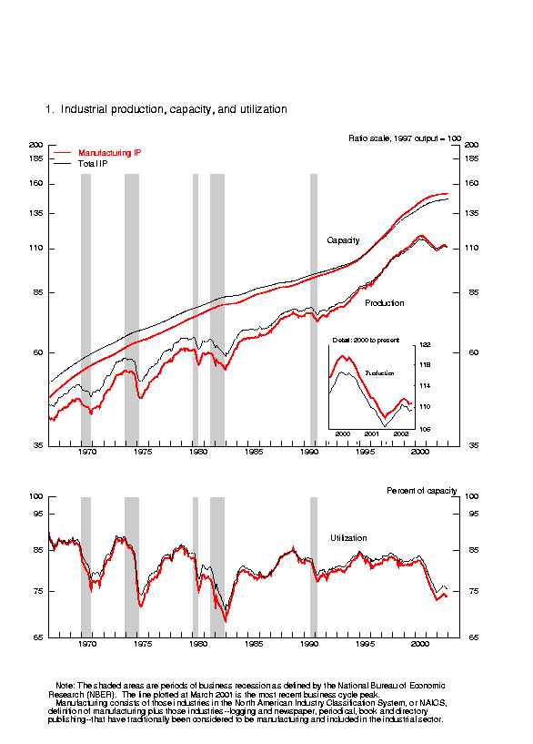 ![]() Release Date: December 17, 2002 Release dates | Historical data | Documentation Current Monthly Release Other formats: ASCII | PDF (144 KB) Supplemental Monthly Release Other formats: ASCII | PDF (144 KB) Annual Revision Release Other formats: ASCII | PDF (150 KB) INDUSTRIAL PRODUCTION AND CAPACITY UTILIZATION Industrial production rose 0.1 percent in November after a revised drop of 0.6 percent in October. At 110.8 percent of its 1997 average, output was 1.8 percent above its level in November 2001. Manufacturing output edged up 0.1 percent in November; the increase was led by a sharp rebound in the production of motor vehicles and parts. Excluding motor vehicles and parts, manufacturing output declined 0.3 percent in both November and October. Capacity utilization for total industry edged up to 75.6 percent, a level 0.5 percentage point above that of November 2001 and 5.9 percentage points below its 1972-2001 average.