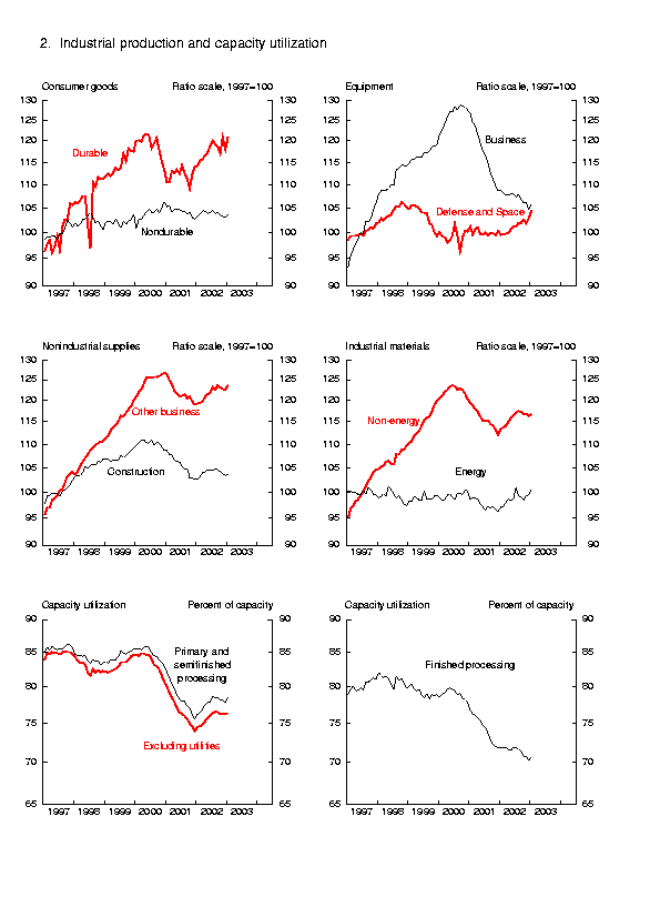 The output of consumer goods rose 1.0 percent in January. Within consumer durables, most of the gain resulted from the higher output of automotive products. The production of nondurables, which moved up 0.5 percent, was led by a sharp increase in residential electricity and gas usage associated with a return to more normal temperatures in January from an unseasonably warm December. However, the output of automotive gasoline dropped after two months of sizable gains, and the production of nondurable non-energy consumer goods, which include food, chemicals, and clothing, remained sluggish. The output of business equipment picked up 1.0 percent in January, although the index for this category remained 2.9 percent below its level in January 2002. Gains in the production of business equipment were widespread. The output of transit equipment moved up, as higher assemblies of business autos and trucks more than offset continued declines in the production of commercial aircraft and related equipment. The output of information processing equipment expanded 1.2 percent in January; data that have been revised up now indicate that production in this group contracted at an annual rate of 0.7 percent in the fourth quarter. The production of industrial and other equipment rose 0.7 percent, a move that reversed most of the previous month's decline. The output of construction supplies was little changed in December and January. The production of business supplies climbed 0.9 percent in January, an increase that largely reflected a jump in energy output for commercial use. The index for defense and space equipment rose 1.6 percent last month and was 4.9 percent above its level in January 2002. The index of industrial materials moved up 0.6 percent in January, as a decline in the output of nondurable materials was more than offset by increases in durable materials and energy materials. The increase in durable materials mainly reflected gains in the production of parts for motor vehicles, while further declines in textiles and chemicals pulled down nondurable materials.