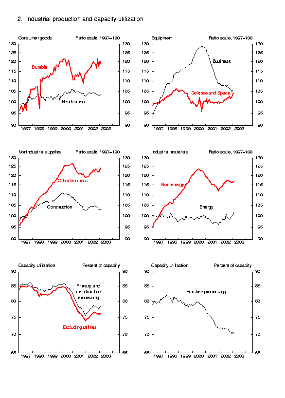 The output of consumer goods fell 0.3 percent in February. A decline of 1.4 percent in the production of durables reflected mainly a drop of 2.2 percent in the output of automotive products. The production of nondurables moved up 0.1 percent. An expansion of 1.1 percent in the output of consumer energy products, which includes sales of residential electricity and gas, more than offset a contraction in non-energy consumer goods that resulted primarily from a decline in the production of foods and tobacco. The output of business equipment was unchanged in February and was 2.4 percent below its level of a year ago. The production of transit equipment fell 1.5 percent as a result of a drop in the assemblies of business autos. The index for information processing equipment edged up slightly, to its highest level in fifteen months, but remained more than 15 percent below its January 2001 peak. The modest increases in the production of industrial and other equipment in January and February were led by gains in the output of industrial and other general purpose machinery. The index for defense and space equipment moved up further in February and has risen 4.6 percent during the past twelve months. The output of construction supplies was little changed, on balance, in January and February. Business supplies expanded in February for the second consecutive month, as commercial energy products, especially commercial and other electricity sales, increased significantly. The index of industrial materials, which rose 0.3 percent in February, was boosted by another sizable increase in the production of energy materials. The production of non-energy materials was unchanged, as a small decline in durable materials was entirely offset by gains in nondurable materials, particularly paper products and chemical products.
