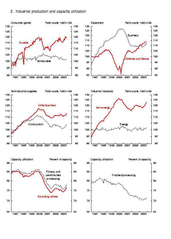 Industrial production rose 0.9 percent in November, its largest increase since October 1999. At 112.9 percent of its 1997 average, output was 1.6 percent above its level in November 2002. Despite a small decline in the production of motor vehicles and parts, manufacturing output climbed 0.9 percent in November. Capacity utilization for total industry moved up 0.6 percentage point, to 75.7 percent, a level 0.3 percentage point higher than its year-earlier level but 5.6 percentage points below its 1972-2002 average.