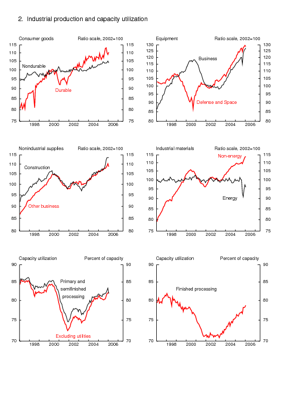 Manufacturing production increased 0.7 percent in January and was 4.5 percent higher than it was in January 2005. The factory operating rate, at 80.5 percent, was the highest since July 2000. The output of durable goods rose 0.7 percent; significant increases were registered in electrical equipment, appliances, and components; motor vehicles and parts; and miscellaneous manufacturing. Durable goods industries with decreases in output in January included wood products, machinery, and primary metals. The production of nondurable goods rose 0.7 percent. Industries with output gains of 1 percent or more were petroleum and coal products, textile and product mills, and chemicals. Food, beverage, and tobacco products; printing and support; and plastics and rubber products posted small gains. Paper was the only nondurable industry with decreased output; production in this industry reversed some of the previous month�s gain. Production in the non-NAICS manufacturing industries (logging and publishing) rose 1.0 percent after a gain of 0.8 percent in December.
