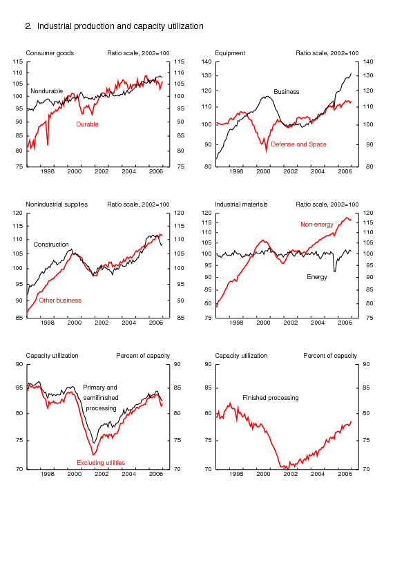 Manufacturing production increased 0.7 percent in December; however, output for the fourth quarter as a whole was down 1.4 percent (annual rate) from the third quarter. In December, the factory operating rate moved up 0.4 percentage point, to 80.4 percent, 0.6 percentage point above its 1972-2005 average. The production of durable goods increased 1.1 percent in December; the largest gains were in motor vehicles and parts and in computer and electronic product manufacturing. Most other major durable goods industries also showed gains; the exceptions were nonmetallic mineral products, fabricated metal products, and furniture and related products, all of which continued their recent monthly declines. Among the selected high-technology industries, gains in computer and peripheral equipment and in semiconductors and related electronic components more than offset a decrease in the output of communications equipment. After five months of declines, primary metal production, supported by an increase of 1.6 percent in iron and steel production, turned up in December. Likewise, machinery manufacturing advanced 1.2 percent after several months of declines. The production of nondurable goods, which increased 0.3 percent, included sizable gains for apparel and leather and for petroleum and coal products; smaller increases were posted in paper, in printing and support, and in chemicals. In contrast, the production indexes for food, beverage, and tobacco products, for textile and product mills, and for plastics and rubber products all declined. Production in the non-NAICS manufacturing industries (logging and publishing) edged up.