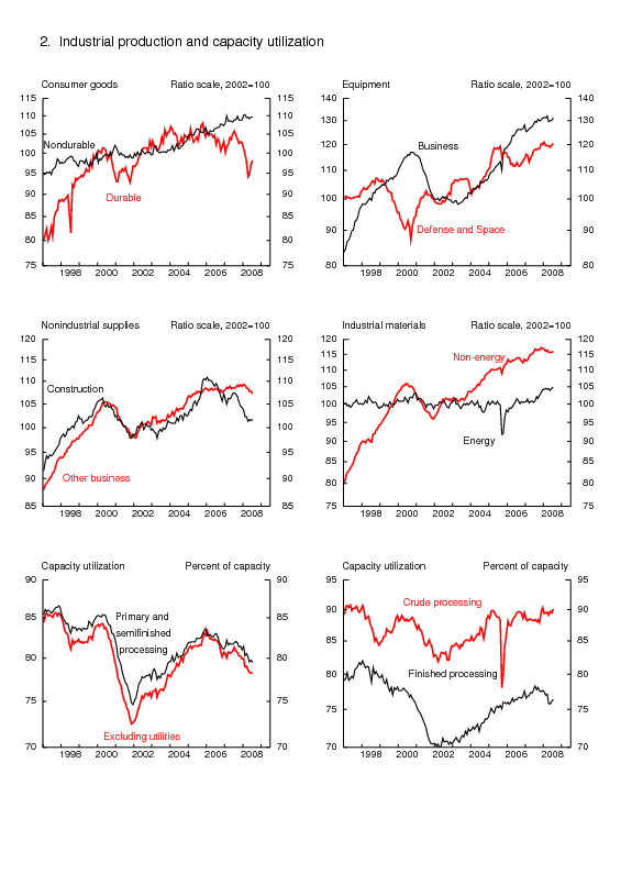 Capacity utilization rates at industries grouped by stage of process were as follows: For the crude stage, utilization rose 0.7 percentage point, to 90.1 percent, a rate 3.5 percentage points above its 1972-2007 average; for the primary and semifinished stages, utilization moved down 0.3 percentage point, to 79.5 percent, a rate 2.7 percentage points below its long-run average; and for the finished stage, utilization increased 0.3 percentage point, to 76.4 percent, a rate 1.3 percentage points below its long-run average.