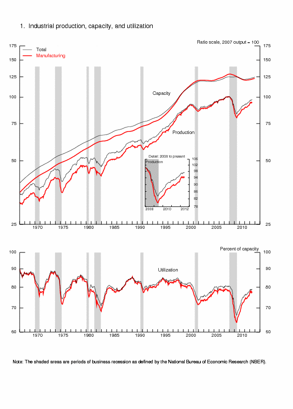 The estimates for industrial capacity in 2012 were revised for this release. The revisions reflect updated measures of physical capacity from various government and trade sources as well as updated estimates of industry capital spending. Capacity for total industry, measured from the fourth quarter of 2011 to the fourth quarter of 2012, is now expected to increase 1.5 percent, a rate that is 0.5 percentage point faster than previously estimated. Manufacturing capacity is expected to rise 1.4 percent in 2012, a pace 0.4 percentage point more than in previous estimates, with slower gains in high-tech industries more than offset by faster gains elsewhere in manufacturing. The increase in mining capacity for 2012 has been revised upward to 2.2 percent, while the change in capacity at utilities is the same as previously estimated.