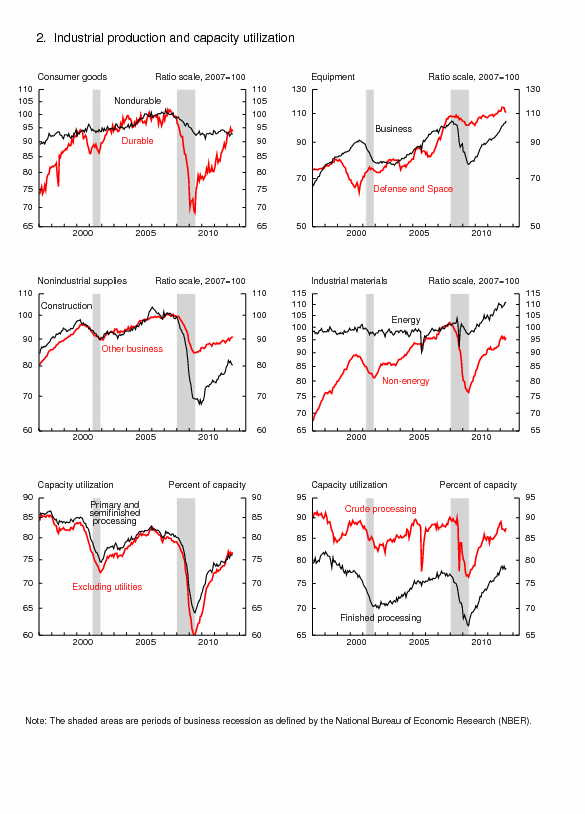 Industrial production increased 0.4 percent in June after having declined 0.2 percent in May. In the manufacturing sector, output advanced 0.7 percent in June and reversed a decrease of 0.7 percent in May. In the second quarter of 2012, manufacturing output rose at an annual rate of 1.4 percent, a marked deceleration from its strong gain of 9.8 percent in the first quarter. The largest contribution to the increase in the second quarter came from motor vehicles and parts, which climbed 18.2 percent; excluding motor vehicles and parts, manufacturing output edged up 0.1 percent. Outside of manufacturing, the output of mines advanced 0.7 percent in June, while the output of utilities decreased 1.9 percent. For the quarter, however, the output of mines fell at an annual rate of 1.2 percent, while the output of utilities rose 14.9 percent. At 97.4 percent of its 2007 average, total industrial production in June was 4.7 percent above its year-earlier level. Capacity utilization for total industry moved up 0.2 percentage point in June to 78.9 percent, a rate 1.4 percentage points below its long-run (1972--2011) average.
