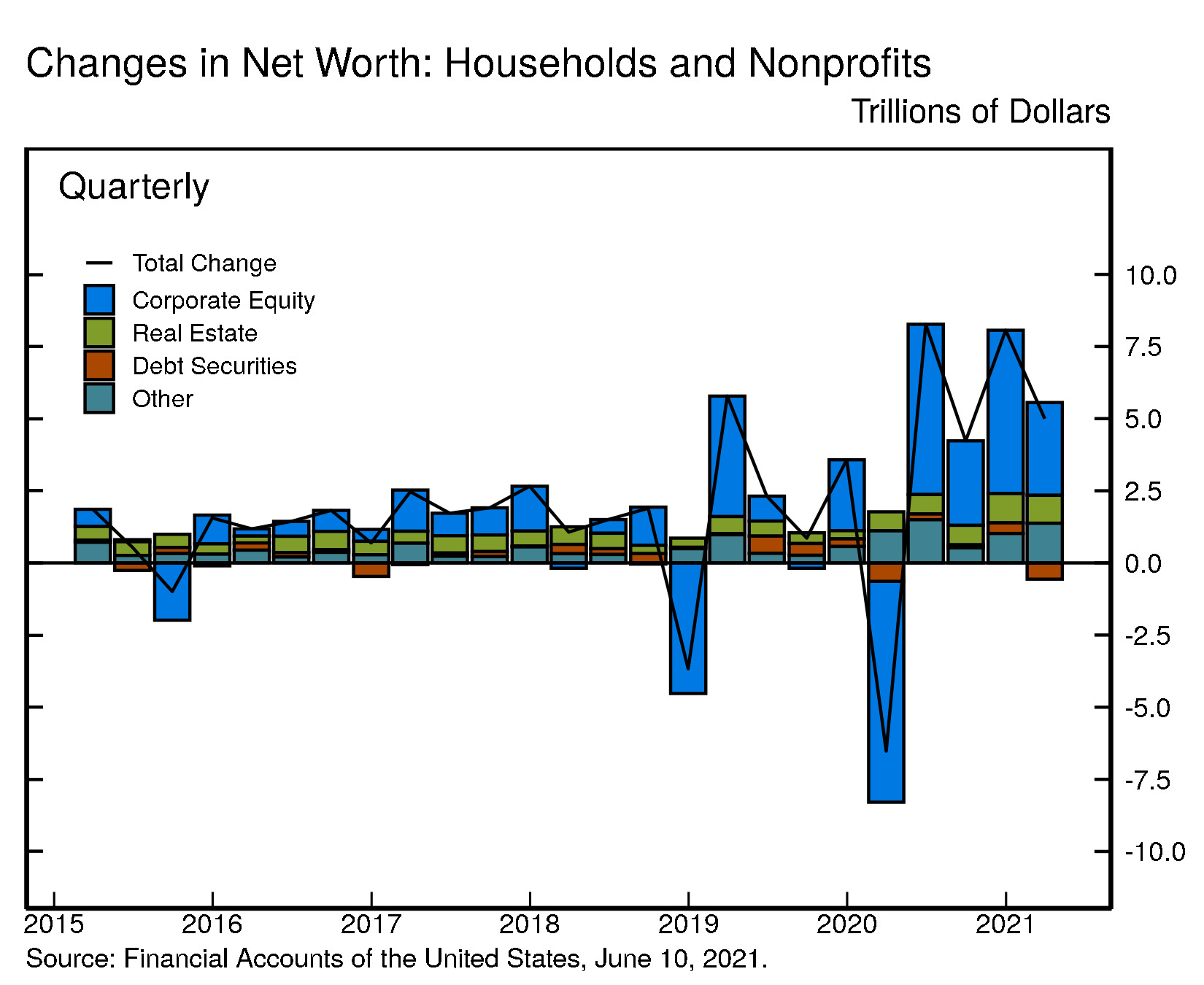 - Changes in net worth consist of transactions, revaluations, and other volume changes. Corporate equity and debt securities include directly and indirectly held securities. Real estate is the value of owner-occupied real estate. Other includes equity in noncorporate businesses, consumer durable goods, fixed assets of nonprofit organizations, and all other financial assets apart from corporate equities and debt securities, net of liabilities, as shown on table B.101 Balance Sheet of Households and Nonprofit Organizations