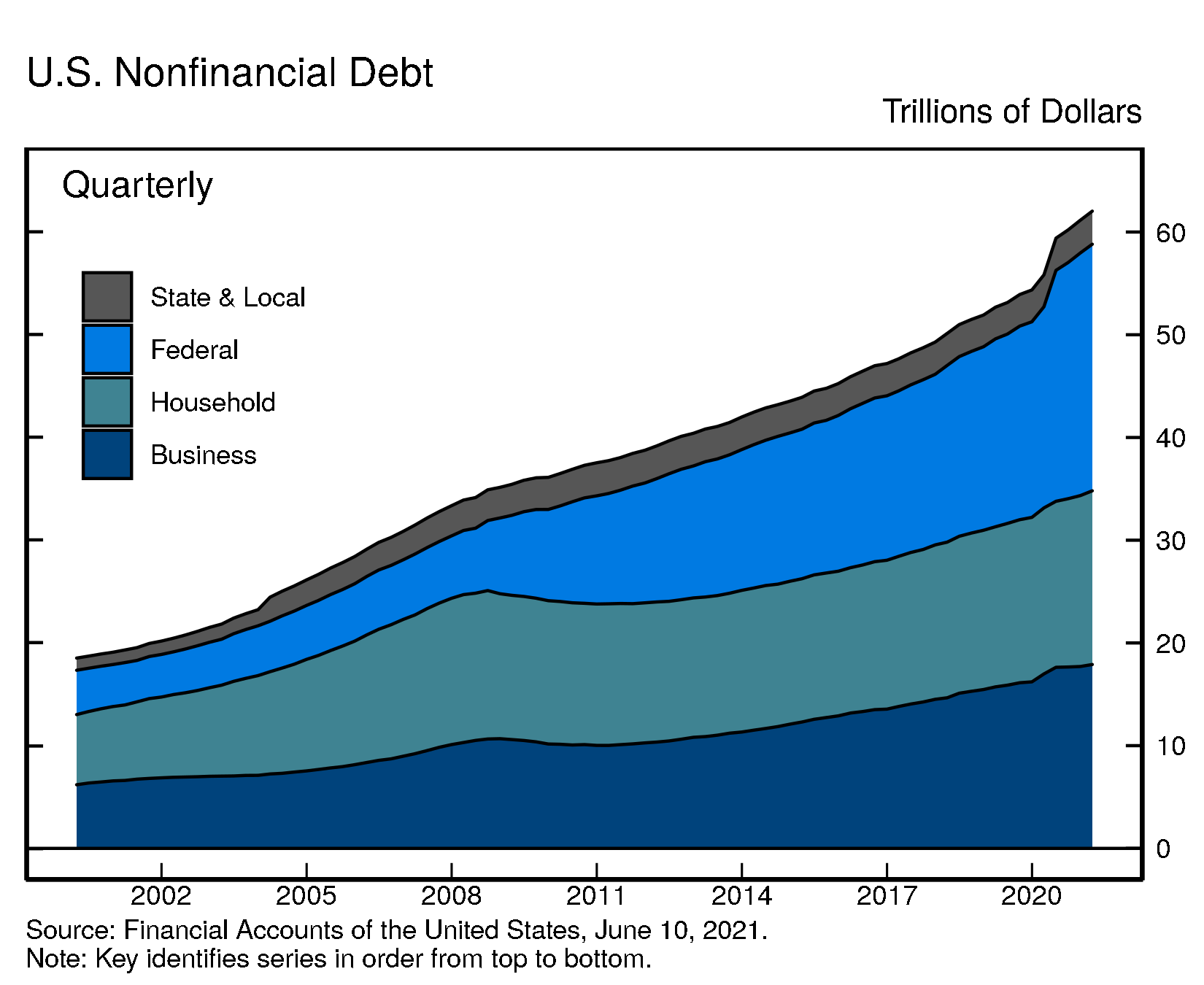 Nonfinancial business debt grew at a rate of 4.4%, reflecting the second round of PPP loans and solid corporate bond issuance. Federal debt rose 6.5%. State and local debt increased 3.8%.