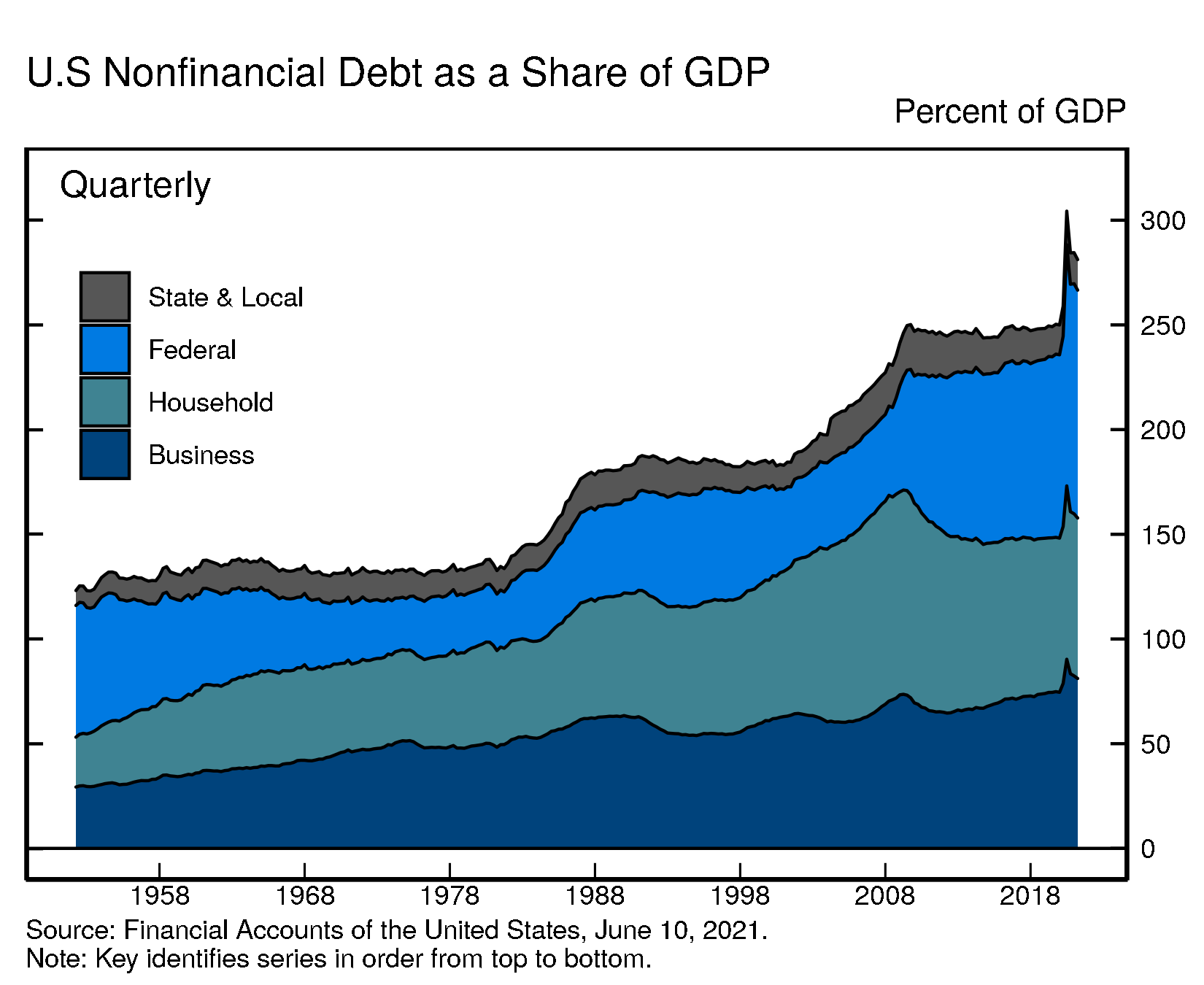 As GDP continued to grow, the ratio of nonfinancial debt to GDP moved down further. In the second quarter of 2020, the ratio had spiked, driven by the drop in GDP and the expansion in federal debt related to the fiscal stimulus.