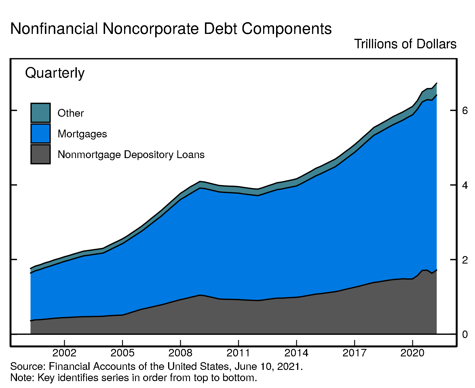 The nonfinancial noncorporate business sector consists mostly of smaller businesses, which are typically not incorporated. Nonfinancial noncorporate business debt was $6.7 trillion, of which $4.7 trillion were mortgage loans and $1.7 trillion were nonmortgage depository loans.