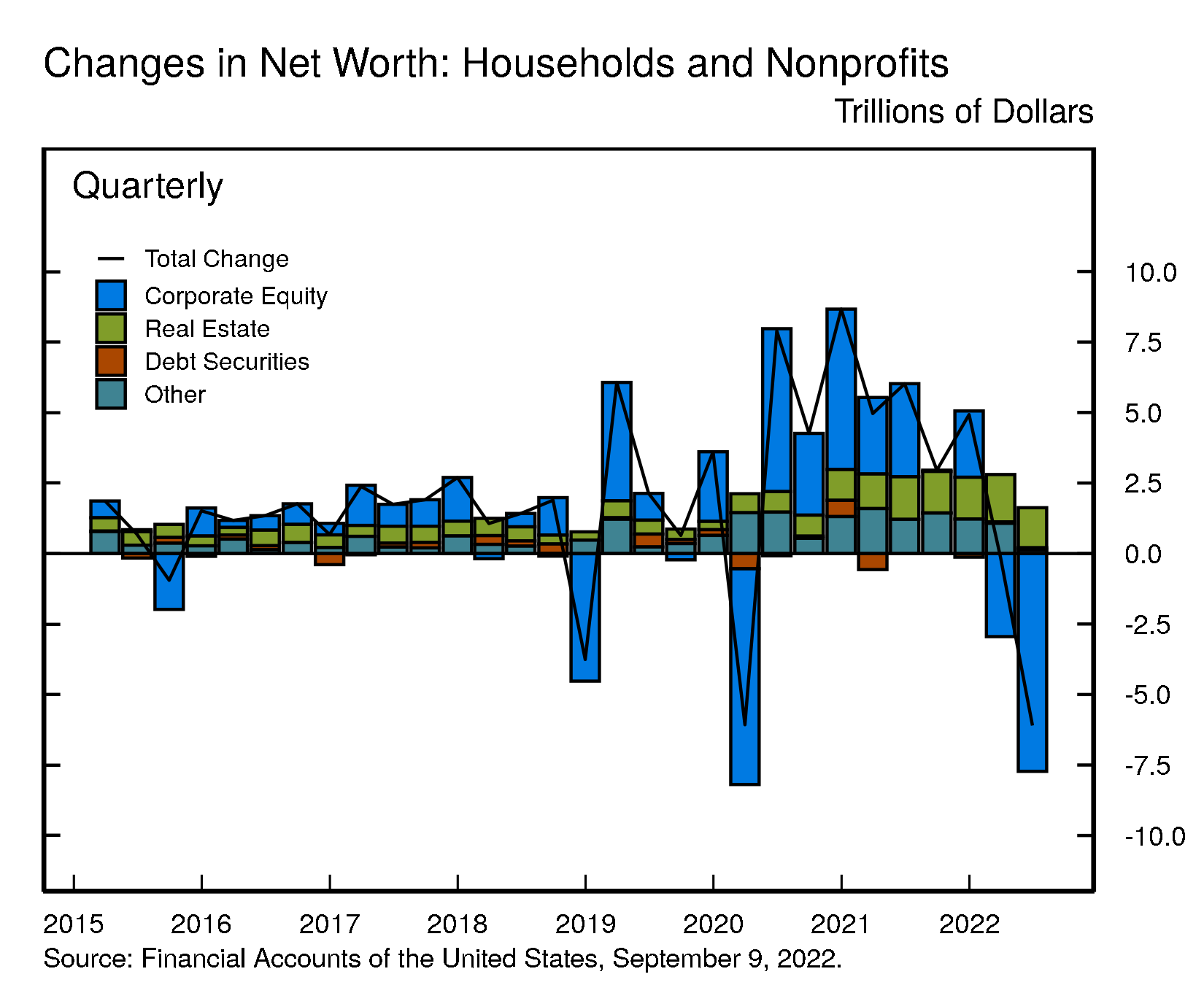 - Household net worth decreased by $6.1 trillion in the second quarter, primarily driven by a drop in stock prices.