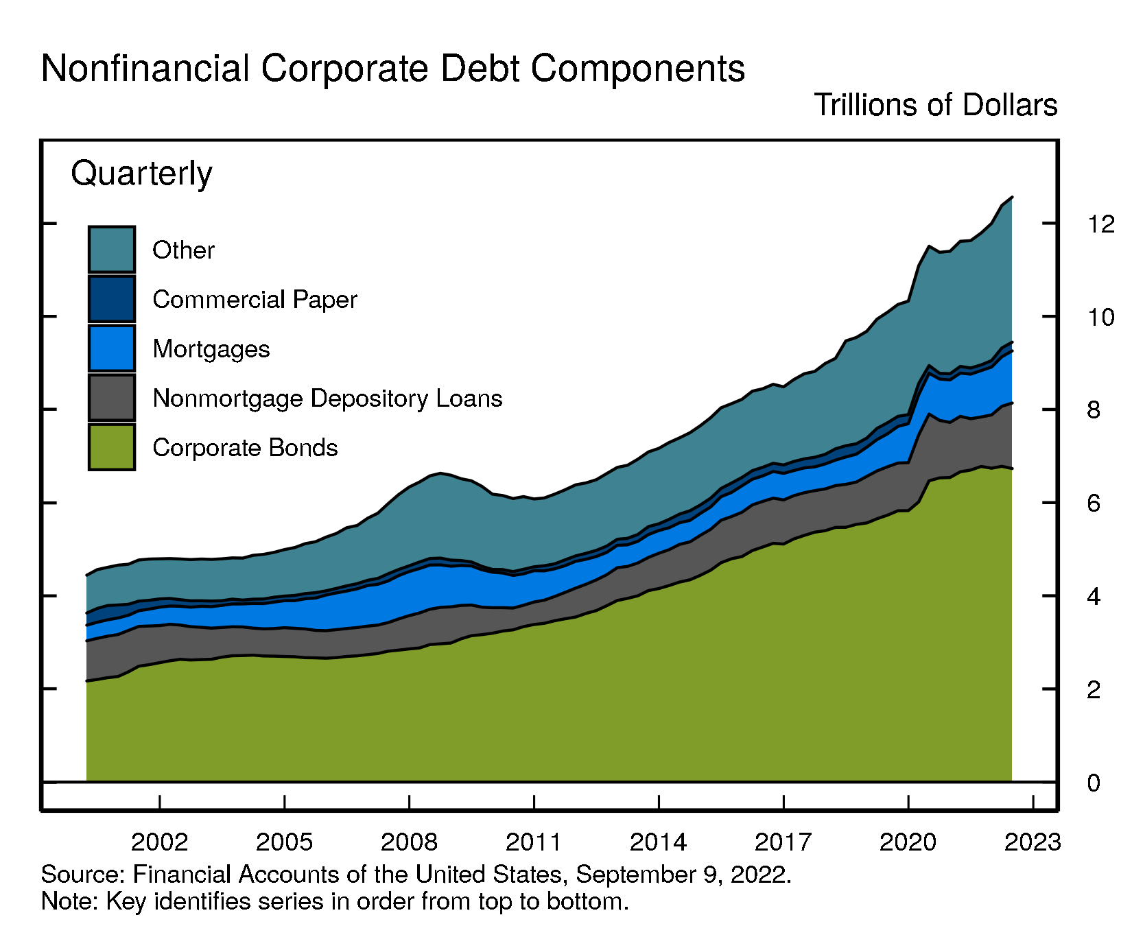 Overall, outstanding nonfinancial corporate debt was $12.6 trillion. Corporate bonds, at roughly $6.7 trillion, accounted for 53% of the total. Nonmortgage depository loans were about $1.4 trillion. Other types of debt include loans from nonbank institutions, loans from the federal government, and commercial paper.