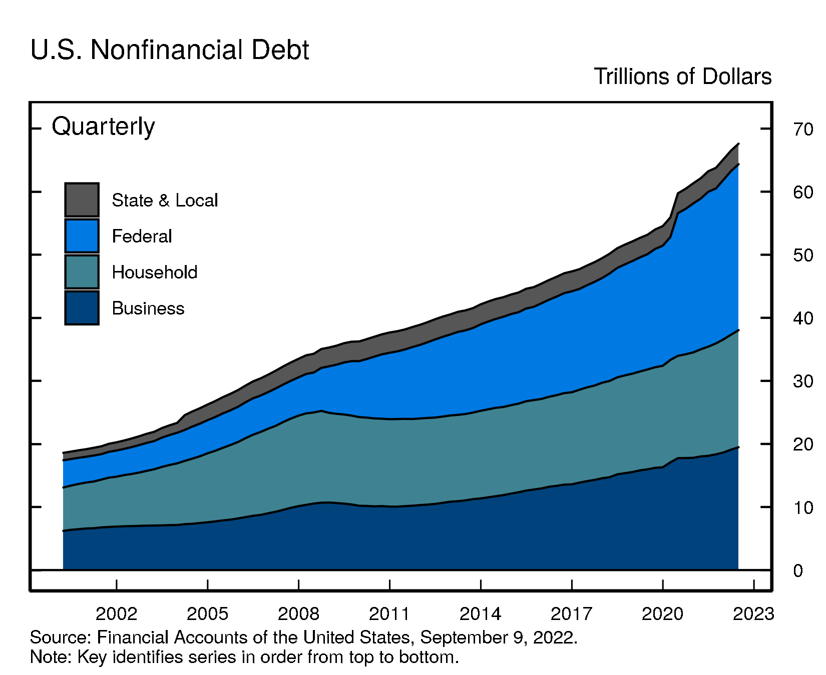 Nonfinancial business debt grew at a rate of 7.7%, reflecting strong growth in loans, particularly those from depository institutions. Federal debt increased by 5.6%. State and local debt increased by 1.6%.