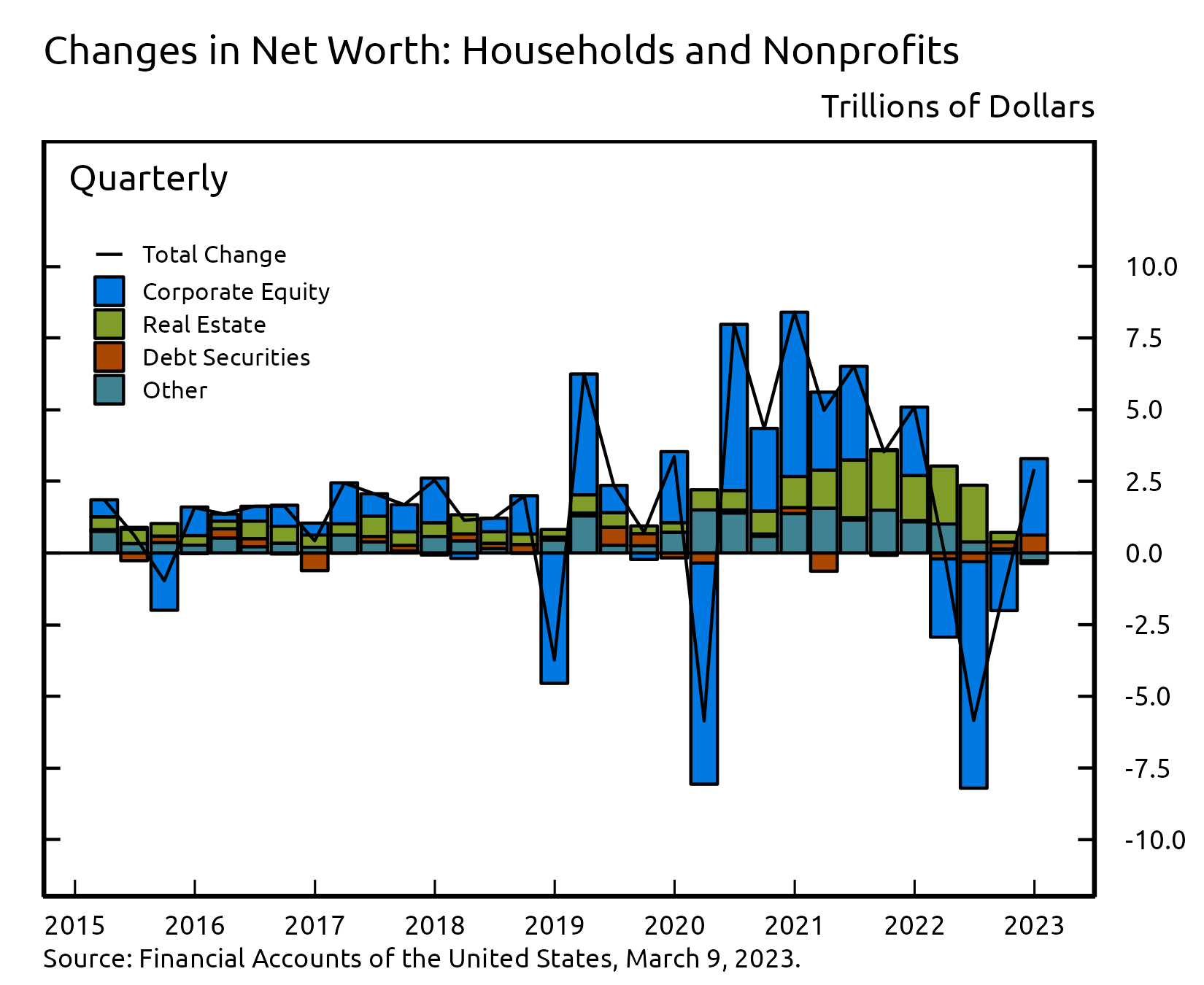- Changes in net worth consist of transactions, revaluations, and other volume changes. Corporate equity and debt securities include directly and indirectly held securities. Real estate is the value of owner-occupied real estate. Other includes equity in noncorporate businesses, consumer durable goods, fixed assets of nonprofit organizations, and all other financial assets apart from corporate equities and debt securities, net of liabilities, as shown on table B.101 Balance Sheet of Households and Nonprofit Organizations.