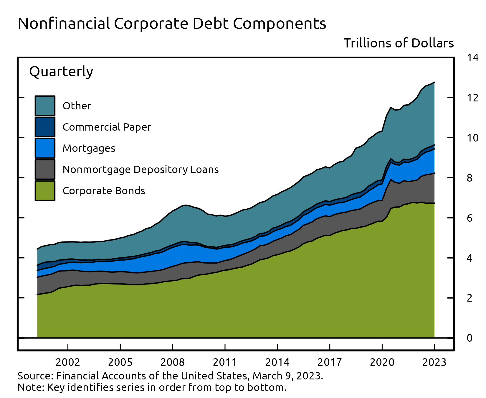 Overall, outstanding nonfinancial corporate debt was $12.8 trillion. Corporate bonds, at roughly $6.7 trillion, accounted for 53% of the total. Nonmortgage depository loans were about $1.5 trillion. Other types of debt include loans from nonbank institutions, loans from the federal government, and commercial paper.