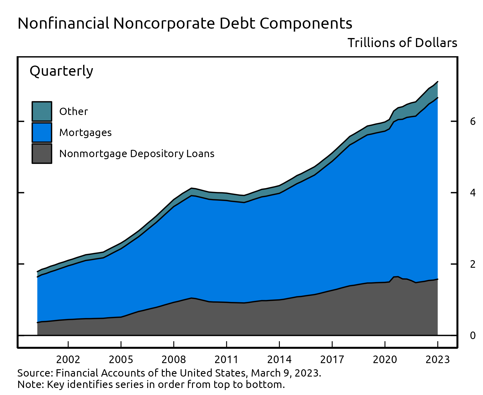 The nonfinancial noncorporate business sector consists mostly of smaller businesses, which are typically not incorporated. Nonfinancial noncorporate business debt was $7.1 trillion in the fourth quarter. Mortgage loans, at roughly $5.1 trillion, accounted for about 72% of the total, while nonmortgage depository loans ($1.6 trillion) accounted for most of the remainder.
